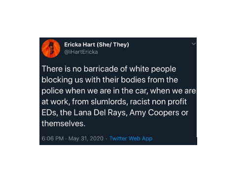 Hart, Ericka. “Black people do this work year round to prevent Black death. We do it all the time. When no one is watching.” Instagram. May 31, 2020.
